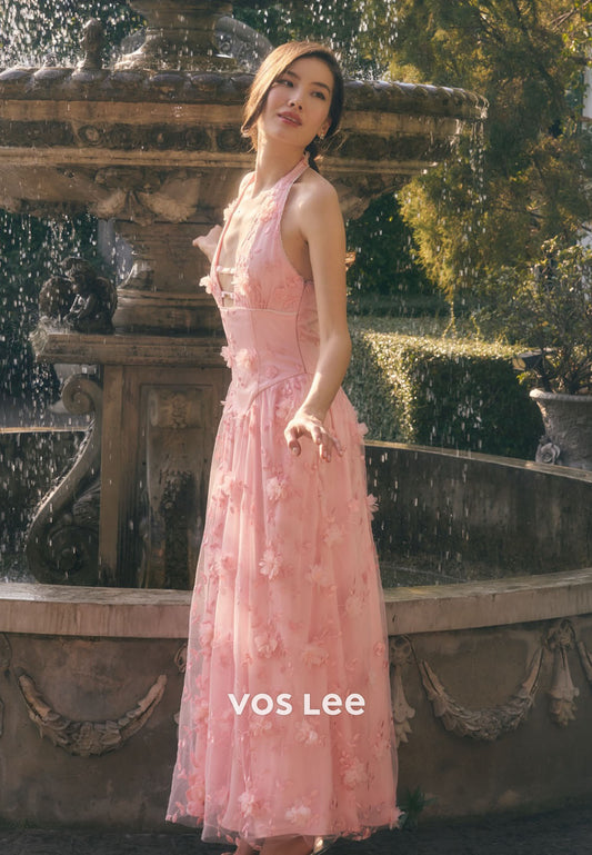 Pink 3D Floral Appliqué Halter Midi Dress Tulle Formal Gown 2026