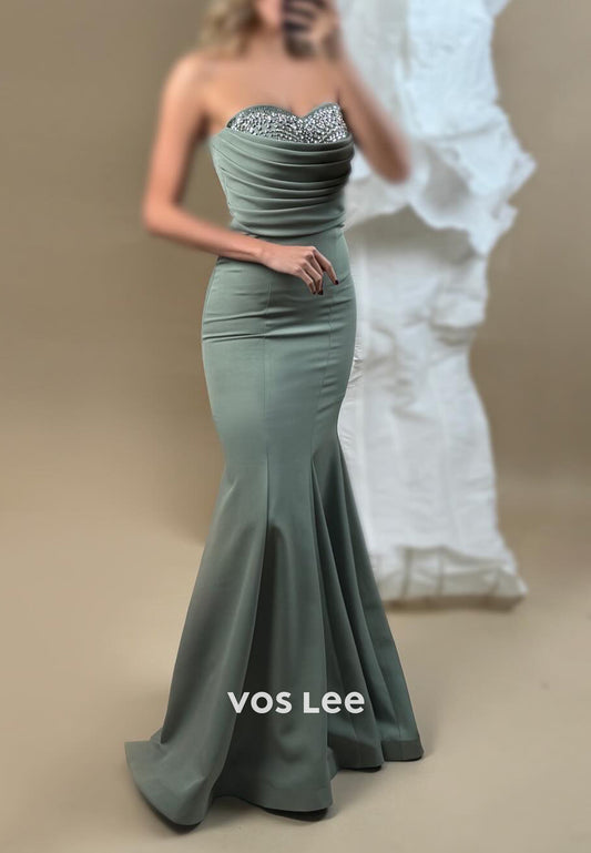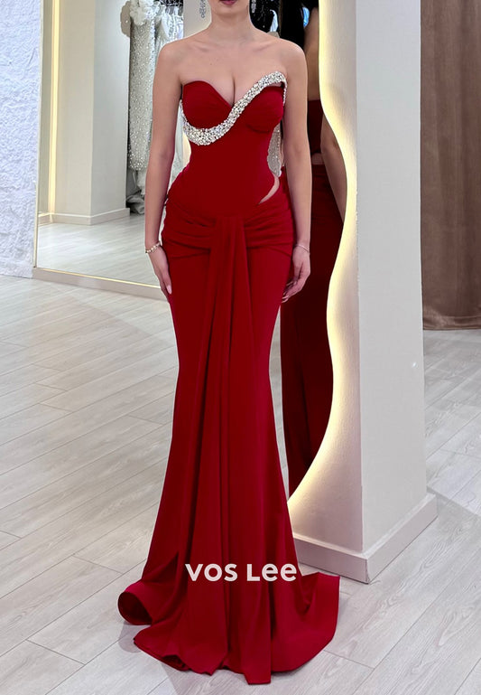 Strapless Sweetheart Rhinestone Pleated Mermaid Evening Dresses with Sweep Train