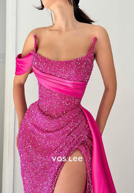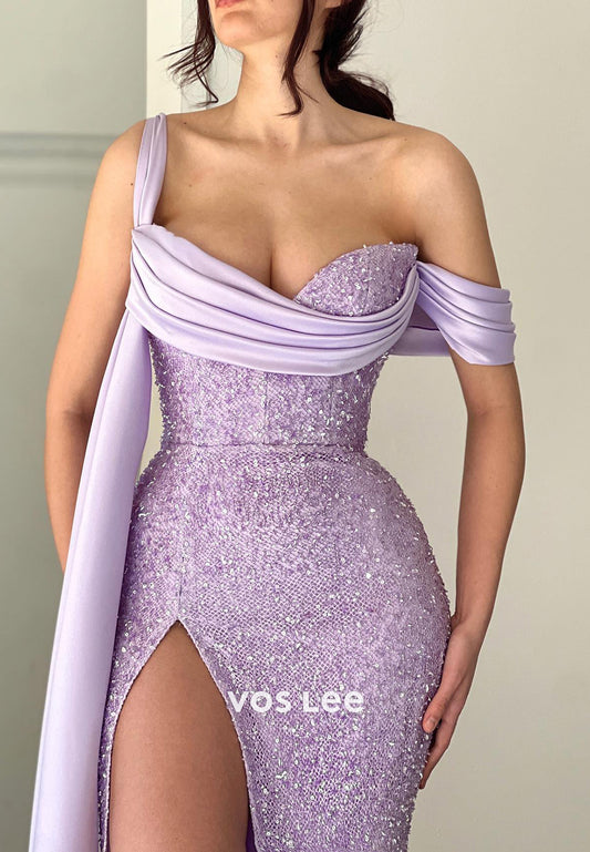 One Shoulder Fully Sequined Pleated Mermaid Long Evening Dresses with Sweep Train