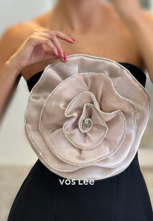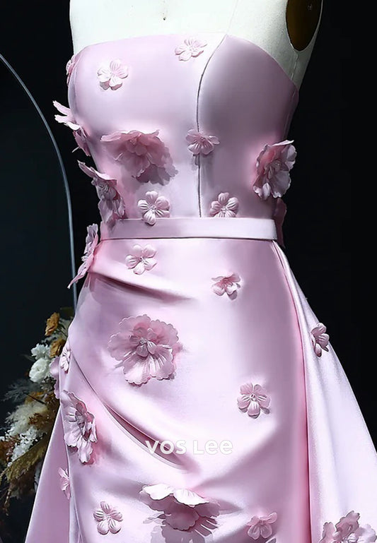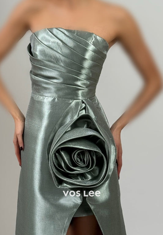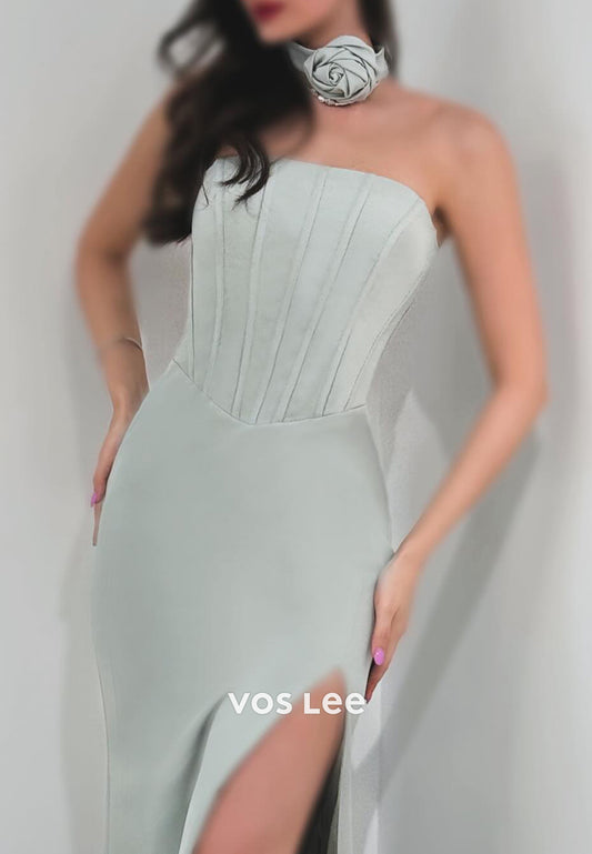 Sparkling Strapless Pleated Flowers Floor-Length Sheath Prom Dresses with High Split