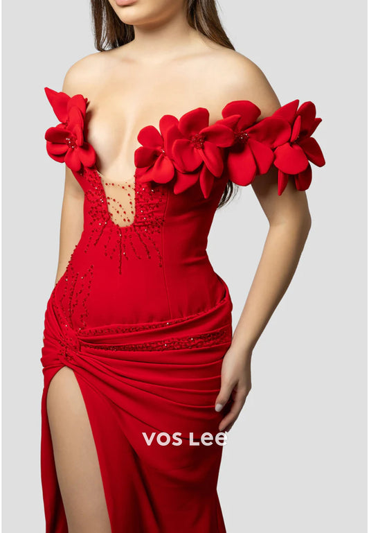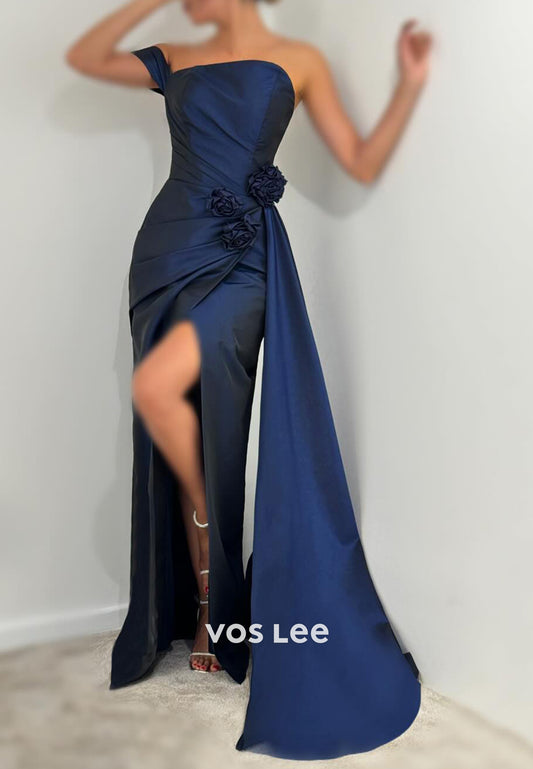 One Shoulder Flowers Embellished Floor-Length Mermaid Evening Dresses with High Split