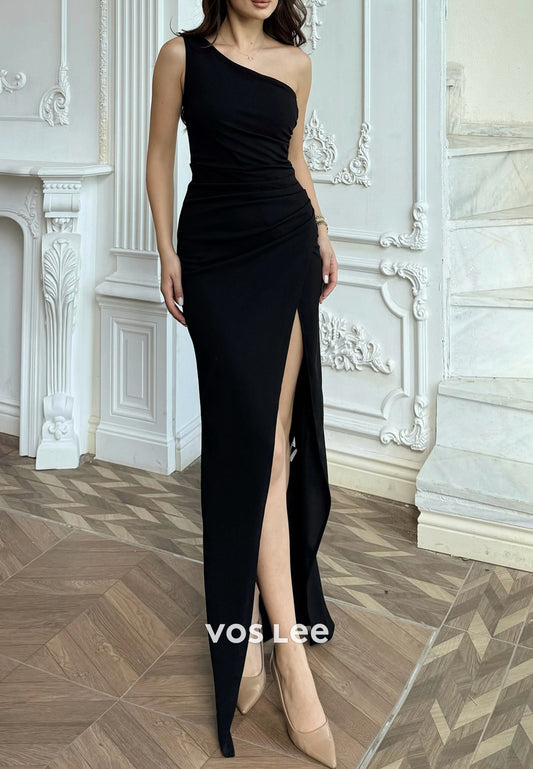 One Shoulder Floor-Length Pleated Mermaid Evening Dresses with High Split