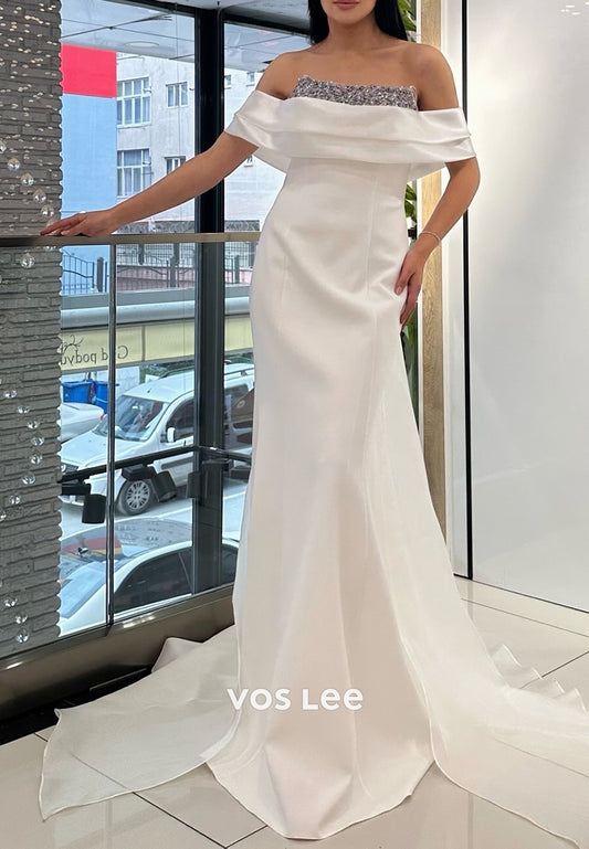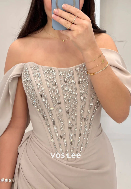 Off the Shoulder Pearls Rhinestone Pleated Mermaid Evening Dresses with Sweep Train
