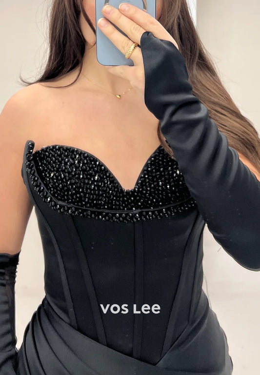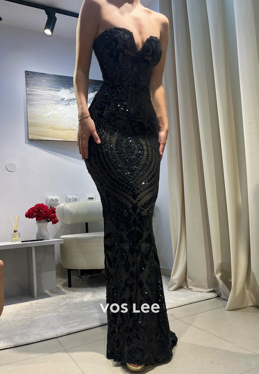 Sparkling Black Strapless Sweetheart Floor-Length Pleated Mermaid Evening Dresses