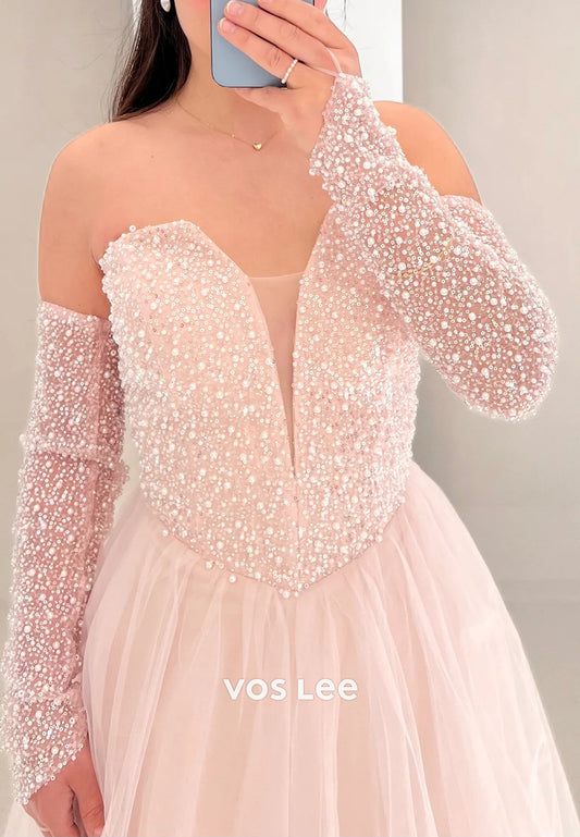 A-Line Long Sleeve Sweetheart Beading Pearls Pleated Prom Dresses with Sweep Train