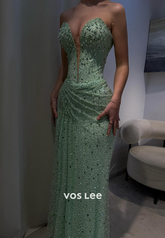 Mint Green Sequins Beaded Sweetheart Strapless Mermaid Evening Dresses with Hihg Spilt