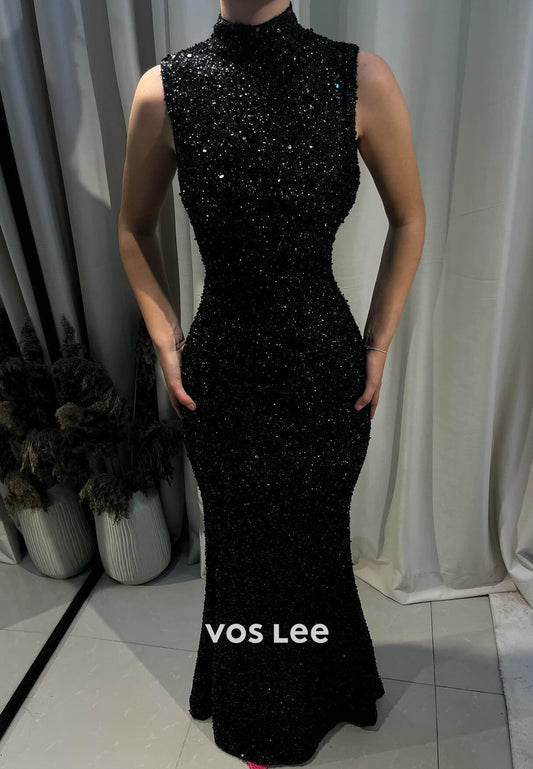 Classic & Timeless High Neck Fully Sequined Beaded Pleated Sheath Evening Dresses