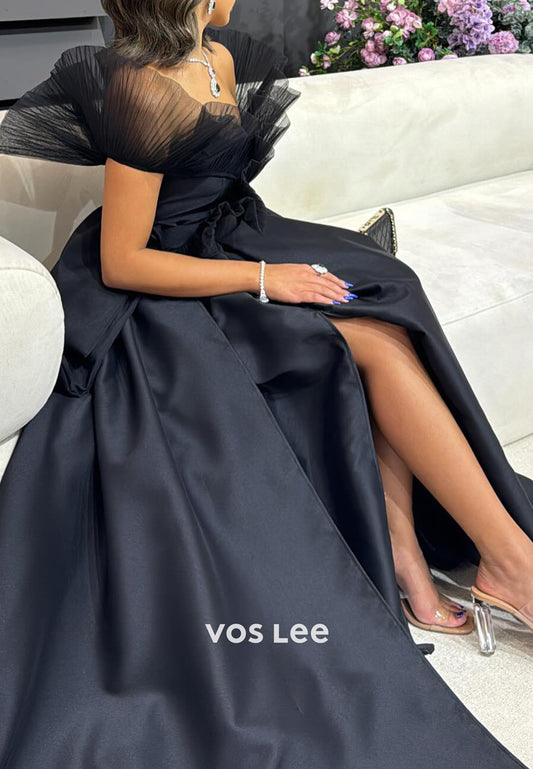 Classic A-Line Off the Shoulder High Split Pleated Prom Dresses with Court Train