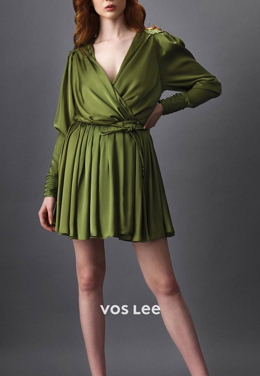 Short & Mini A-Line Long Sleeve V Neck Pleated Wedding Guest Dresses