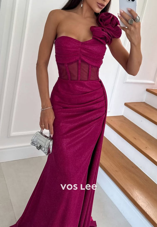 One Shoulder Floral Embellished Pleated Long Mermaid Prom Dresses with Side spilt