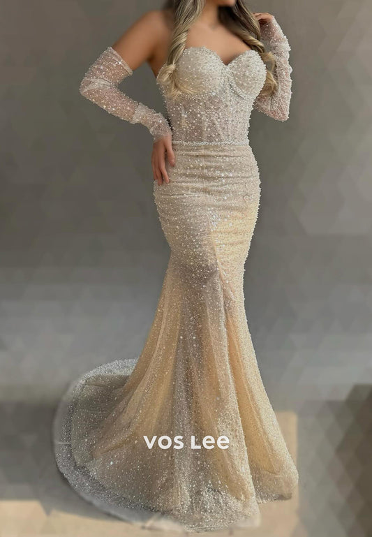 Classic Sequined Long Sleeve Sweetheart Pleated Mermaid Prom Dresses wirh High Spilt