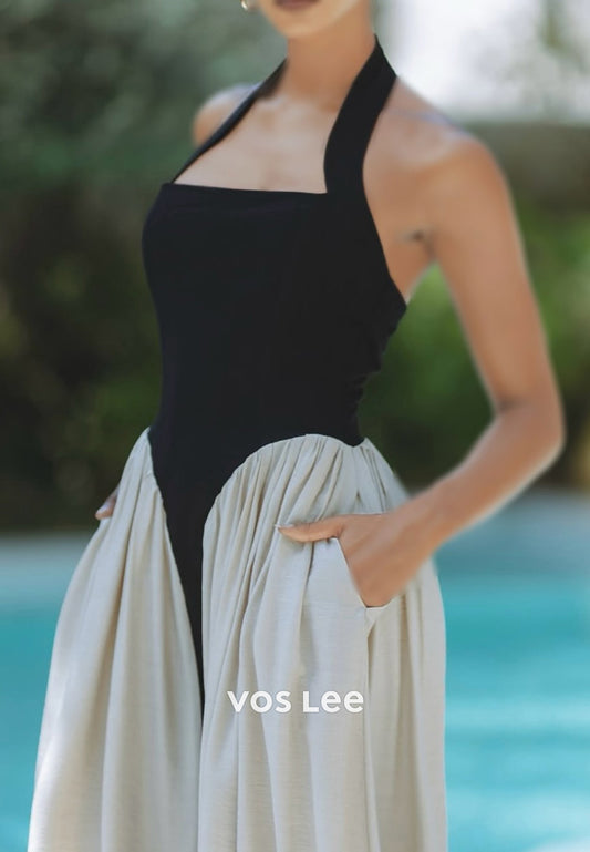 Sexy and Sleek A-Line Halter Ankle-Length Pleated Long Evening Dresses with Pockets