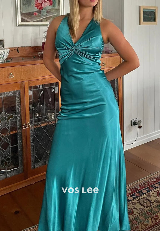 Simple & Casual Halter V Neck Pleated Mermaid Long Prom Dresses with High Split