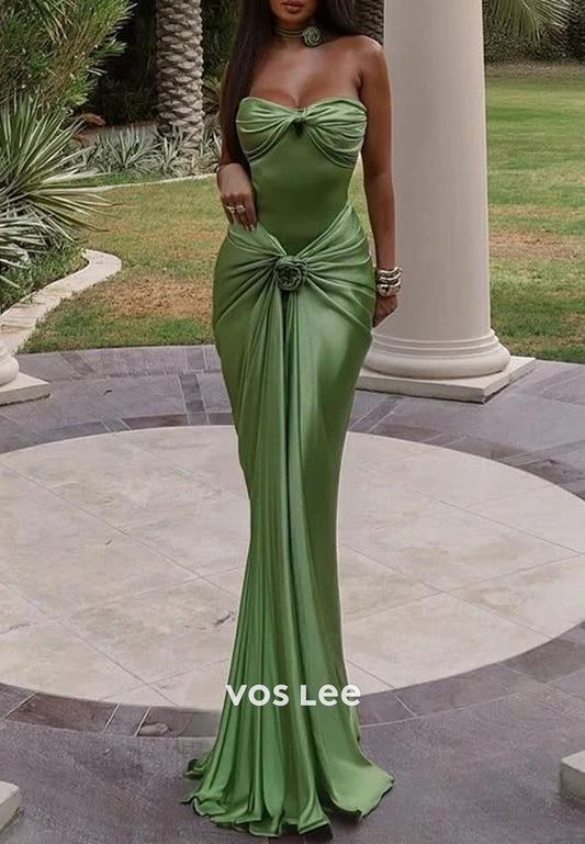 Sexy Strapless Sweetheart Flowers Pleated Mermaid Prom Dresses with Sweep Train