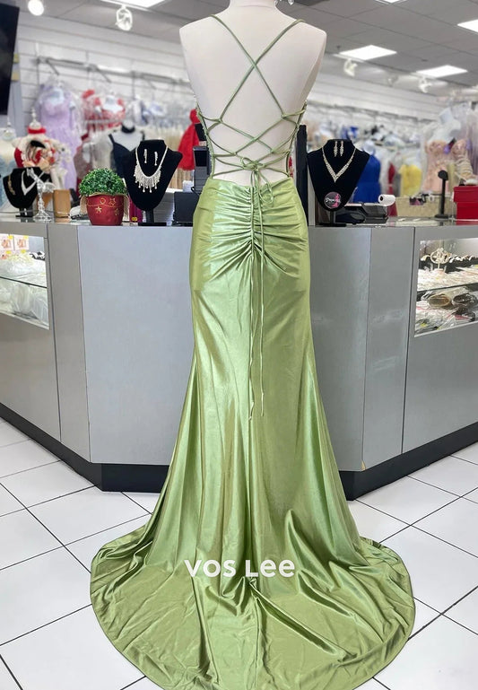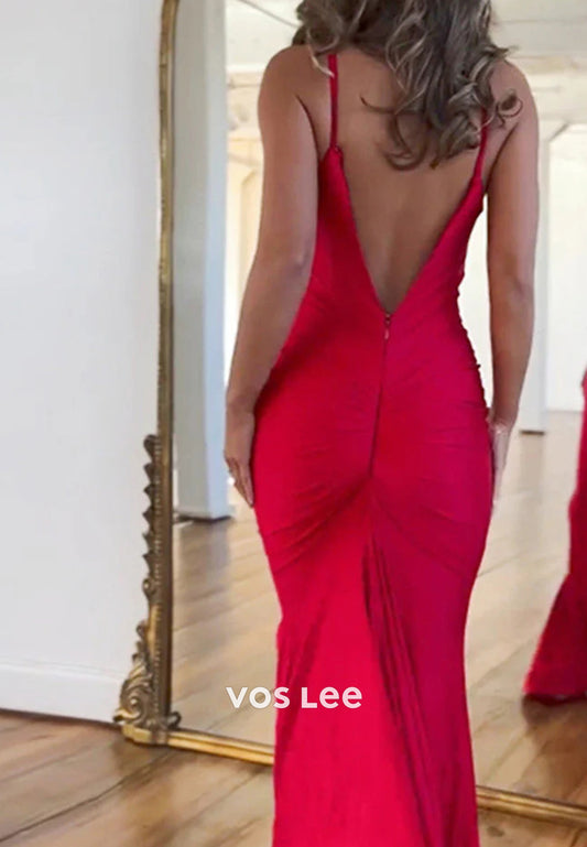 Sexy Spaghetti Straps Scoop Floor-Length Pleated Mermaid Prom Dresses with Split