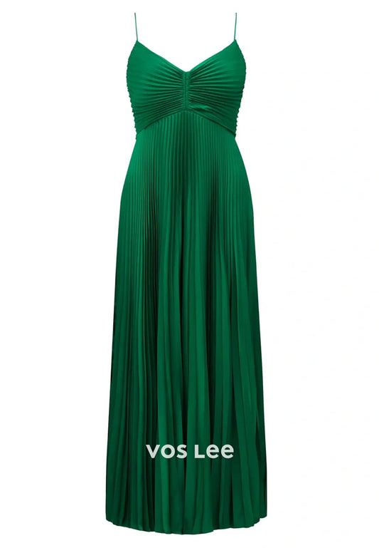 A-Line V Neck Spaghetti Straps Pleated Floor-Length Rhinestone Prom Dresses