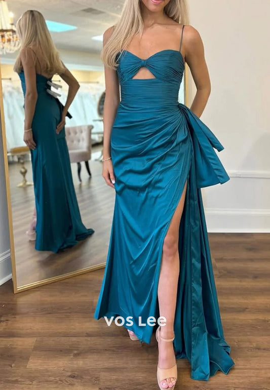 Classic Spaghetti Straps Pleated Floor-Length Mermaid Prom Dresses with Side Split
