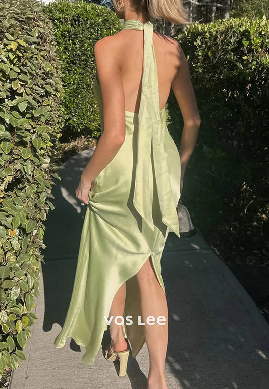 Gorgeous & Charming Halter Sheath Pleated Long Prom Dresses with Split