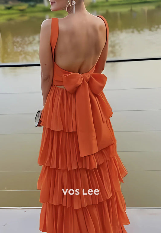Simple & Casual A-Line Scoop Pleated Floor-Length Bowknot Tiered Prom Dresses