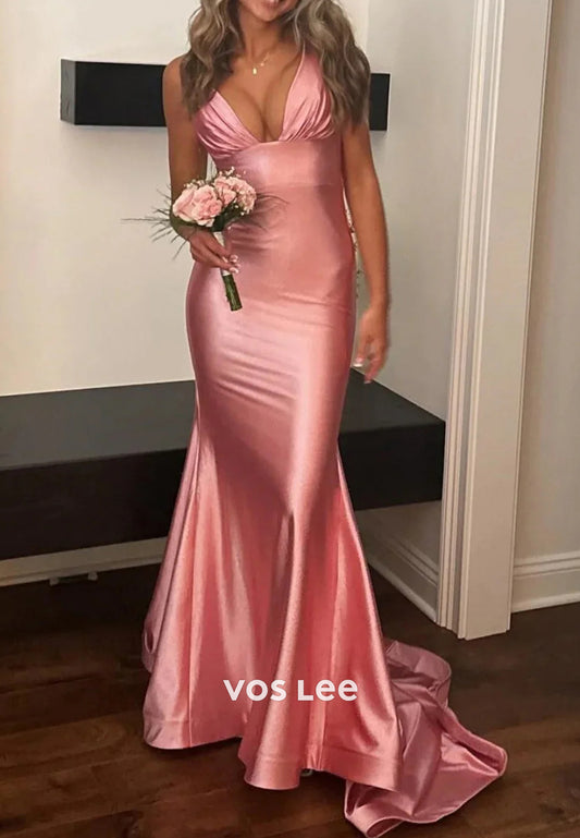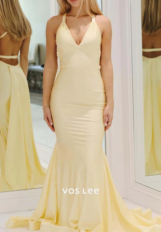 Sexy and Sleek V Neck Halter Pleated Mermaid Long Prom Dresses with Sweep Train