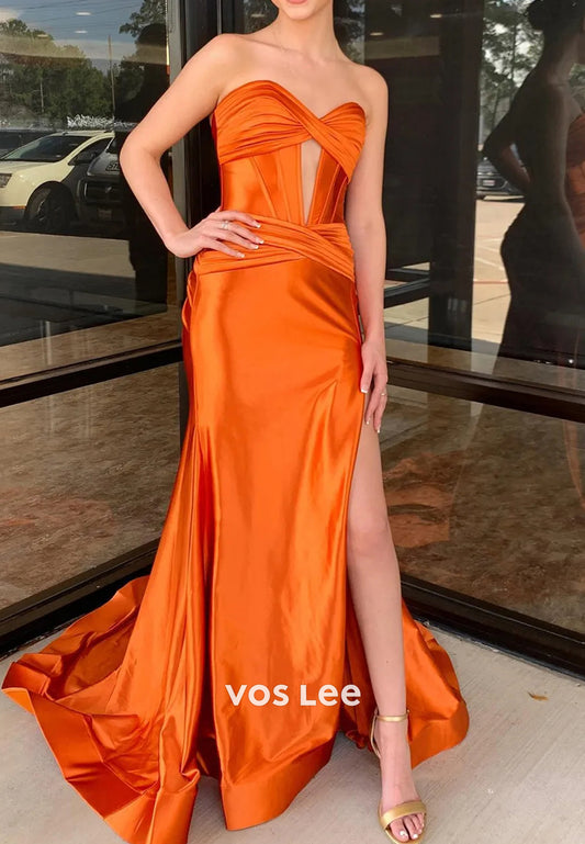 Sexy Strapless Ruched Sweetheart Side Split Mermaid Prom Dresses with Sweep Train
