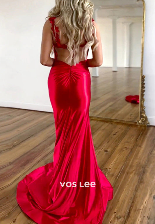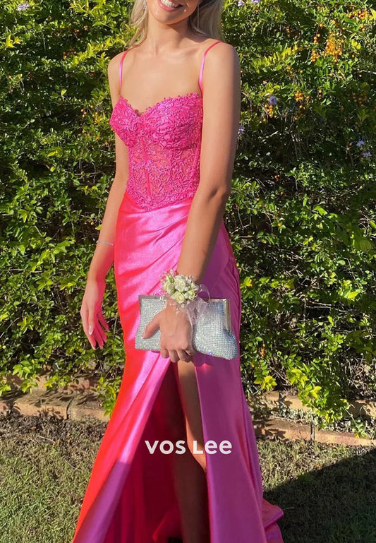 Sexy Spaghetti Straps Sweetheart Appliques Lace Mermaid Prom Dresses with Side Split