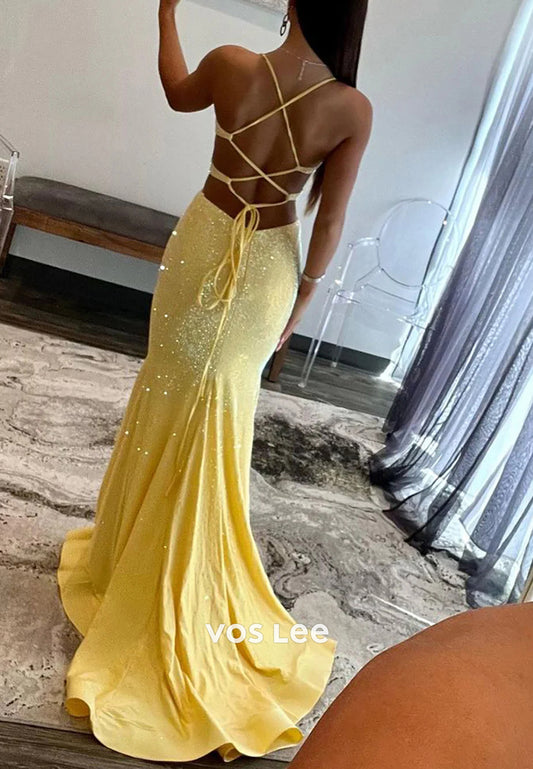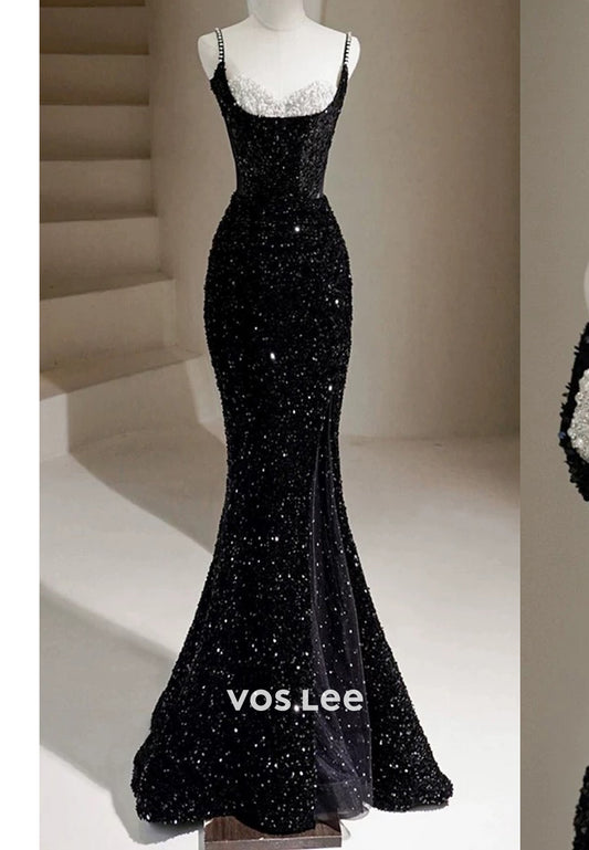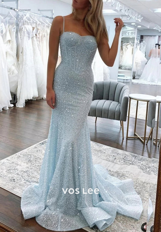 Sparkling & Simple Spaghetti Straps Sequined Mermaid Prom Dresses with Court Train