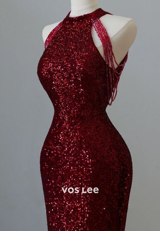 Classic&Simple Fully Sequined Bead-Fringed Halter Mermaid Floor-Length Evening Dresses