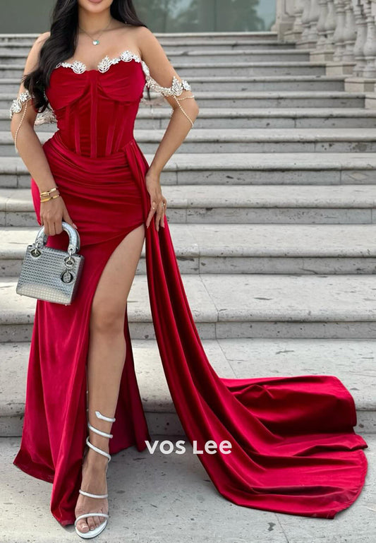 Sparkle & Shine Off the Shoulder Rhinestone Pleated Mermaid Evening Dresses with High Split