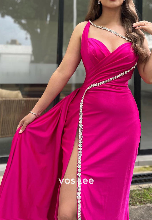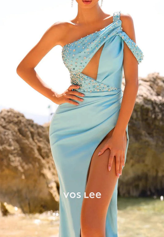 One Shoulder Rhinestone Sweetheart Pleated Mermaid Evening Dresses with High Split