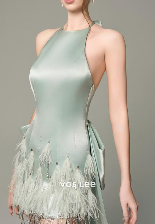 Glamorous & Dramatic High Low Halter Rhinestone Bowknot Feather Evening Dresses