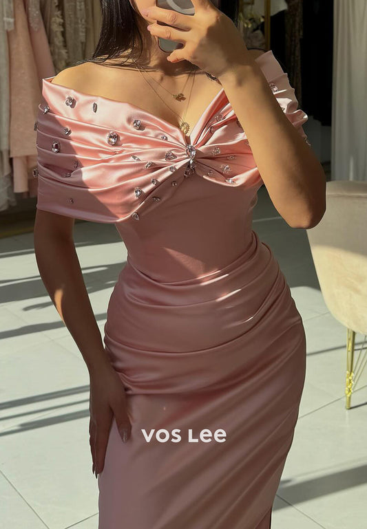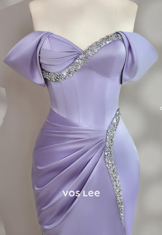 Off the Shoulder Pleated Rhinestone Classic Mermaid Evening Dresses with High Slit