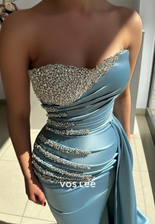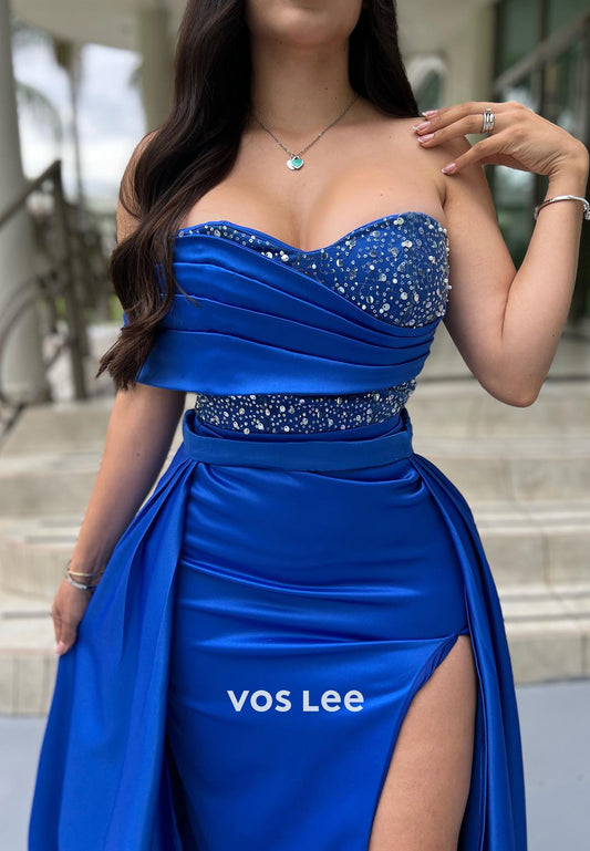 Sweetheart Ruched Rhinestone Mermaid Long Prom Dresses with Side Split