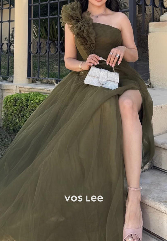 A-Line One Shoulder Floral Embossed Ornate Evening Dresses with Chapel Train
