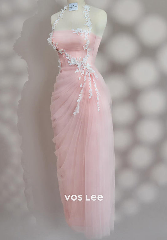 Glamorous & Dramatic Halter Pleated Floral Embossed Mermaid Tulle Party Dresses