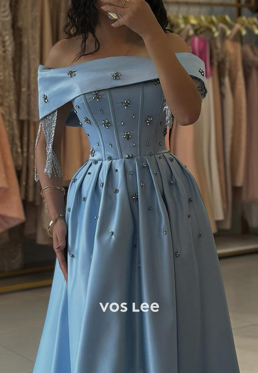 A-Line Sky Blue Off-Shoulder Rhinestone Tassel Prom Dresses with Chapel Train