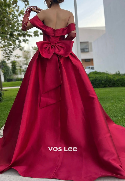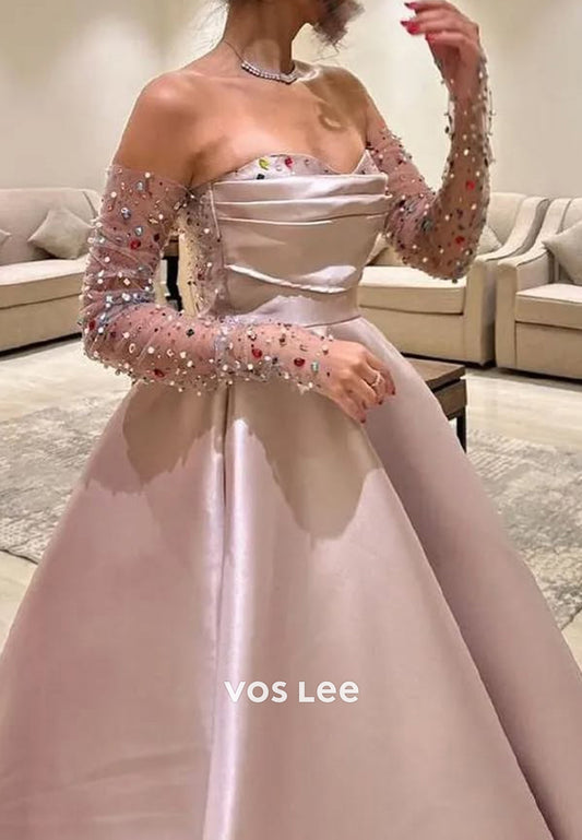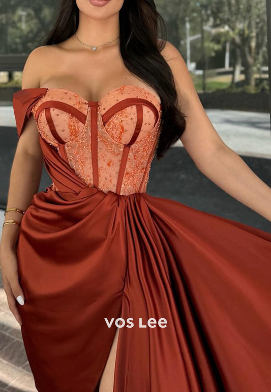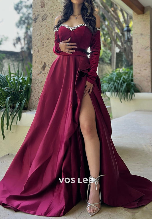 Long Sleeves Off-Shoulder Pearls Sweetheart Evening Dresses with High Split