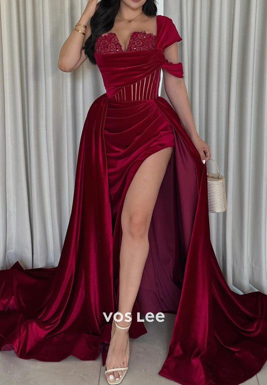 One Shoulder V Neck Pleated Mermaid Velvet Evening Dresses with Side Slit Chapel Train