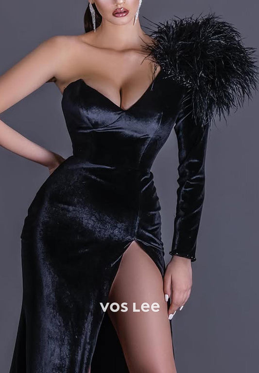 Hot Black One Shoulder Long Sleeves feather Mermaid Prom Dresses with Side Split