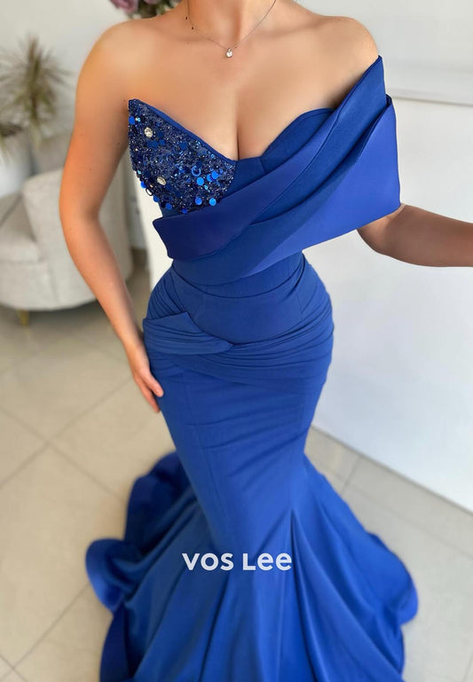 Royal Blue One Shoulder Sweetheart Ruched Mermaid Evening Dresses with Court Train