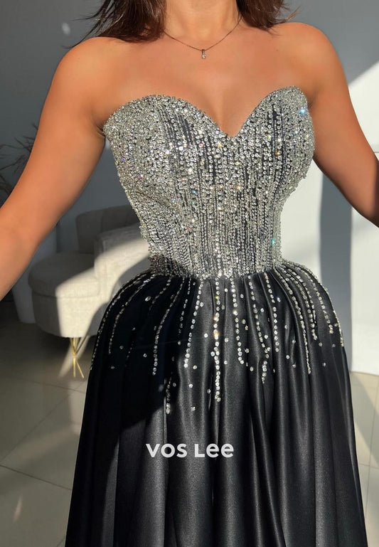 Sparkly A-Line Sweetheart Rhinestone Prom Dresses Evening Dress with High Split