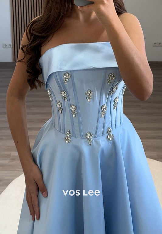 Beaded Crystal Strapless A-Line Satin Homecoming Evening Prom Dress Ball Gown