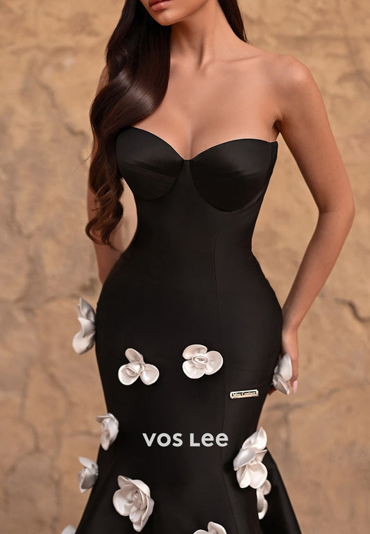 Black Strapless Sweetheart Floral Embellished Mermaid Evening Dresses with Court Train