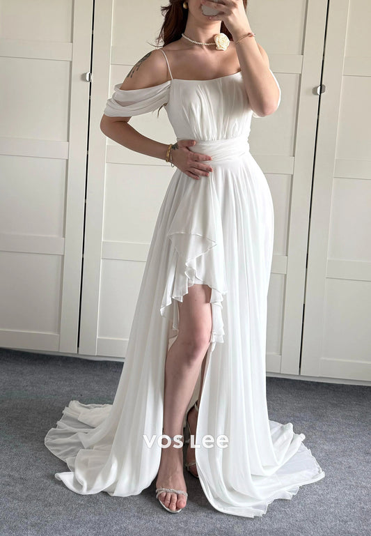 Classic & Timeless A-Line Spaghetti Straps Split Pleated Evening Dresses with Sweep Train