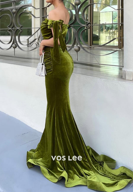 Off the Shoulder Pleated Bowknot Mermaid Velvet Evening Dresses with Sweep Train