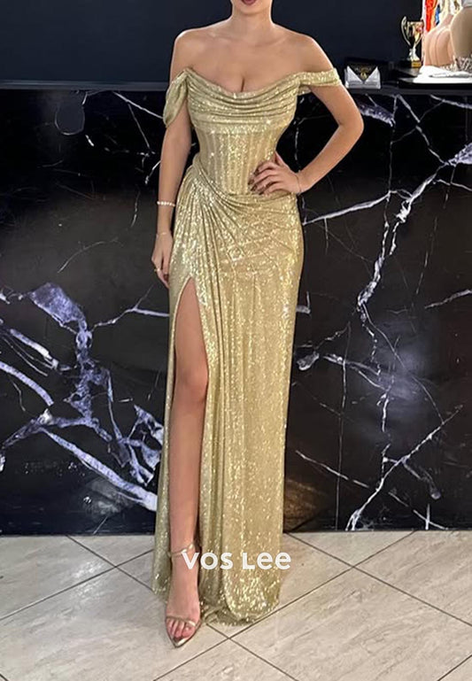 Gold Off-Shoulder Draped Sexy Evening Formal Dresses with High Slit