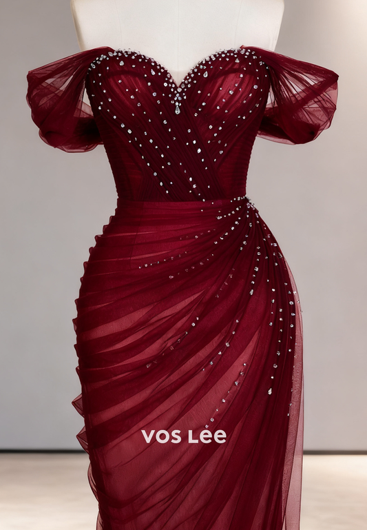 Classic & Timeless Off the Shoulder Fully Beaded Pleated Mermaid Evening Dresses with Split
