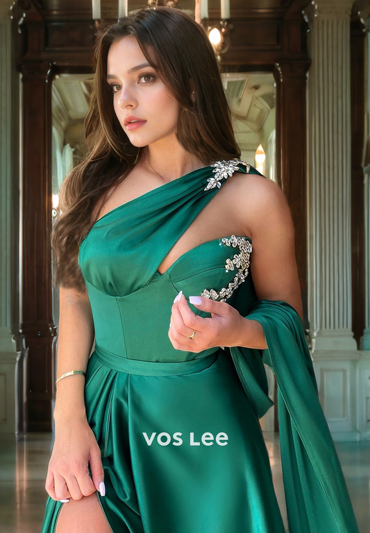 A-Line One Shoulder Beaded Satin Prom Dress with High Slit