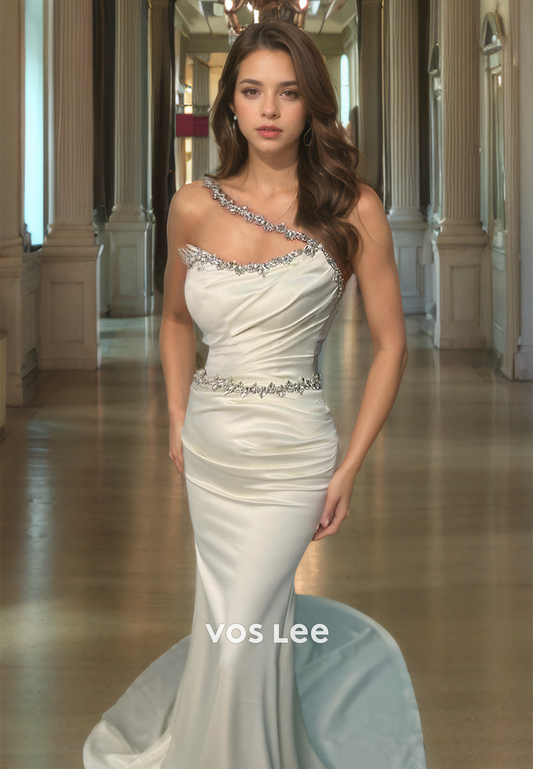 Elegant Floor Length One Shoulder Prom Dress Beads Sleeveless Formal Evening Party Dresses