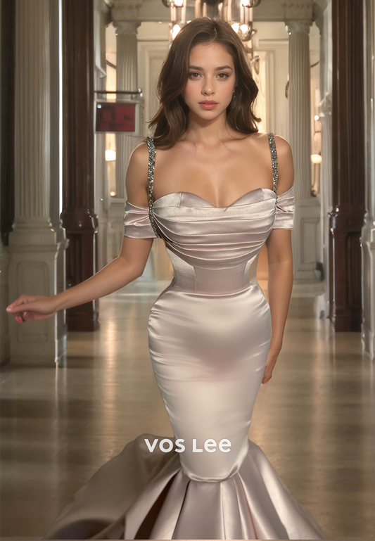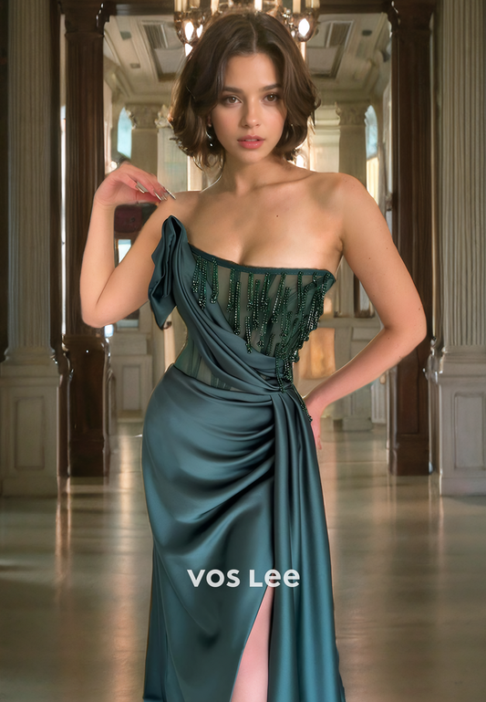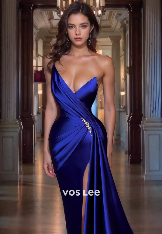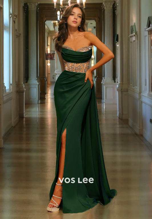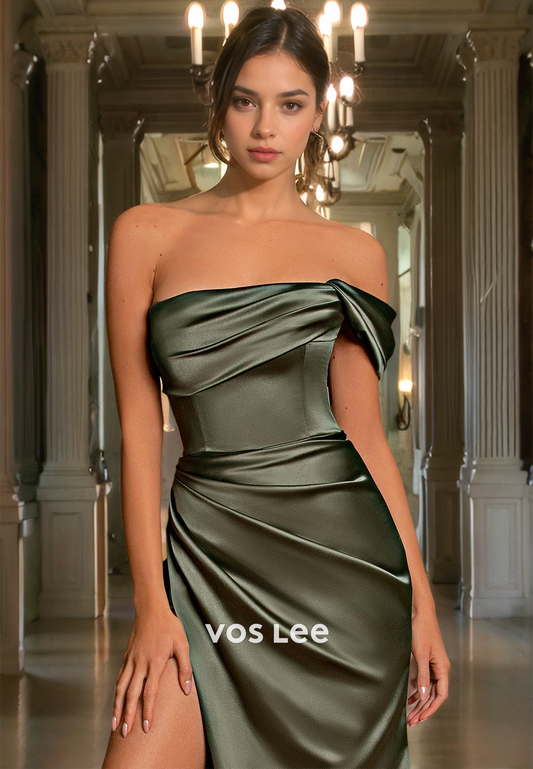 Elegant Pleated Strapless Satin Prom Dress Sleeveless Floor Length Side Slit Formal Dresses